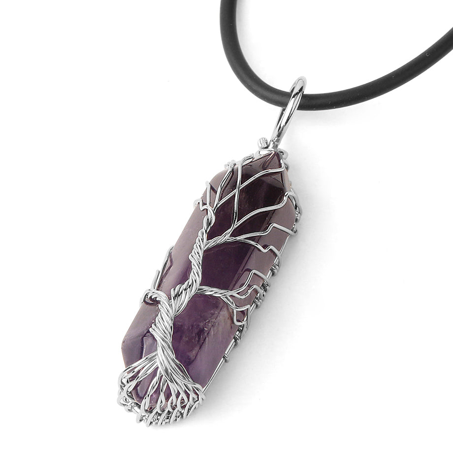 At Solumi.net, we design jewelry that carries both spiritual energy and timeless beauty. This pendant features a hexagonal crystal point wrapped with a silver-color Tree of Life design, symbolizing growth, strength, and harmony. Available in 7 crystal options: Amethyst, Aventurine, Black Onyx, Clear Crystal, Tiger Eye, Rose Quartz, and Opal.