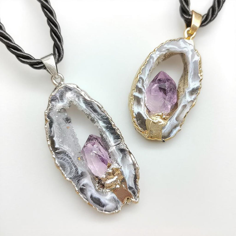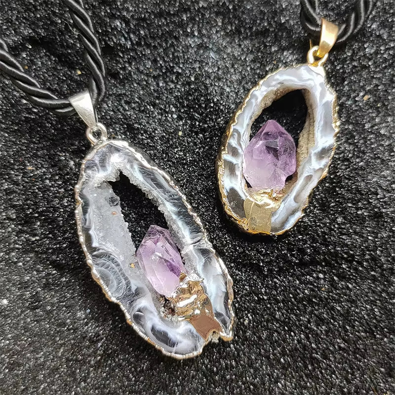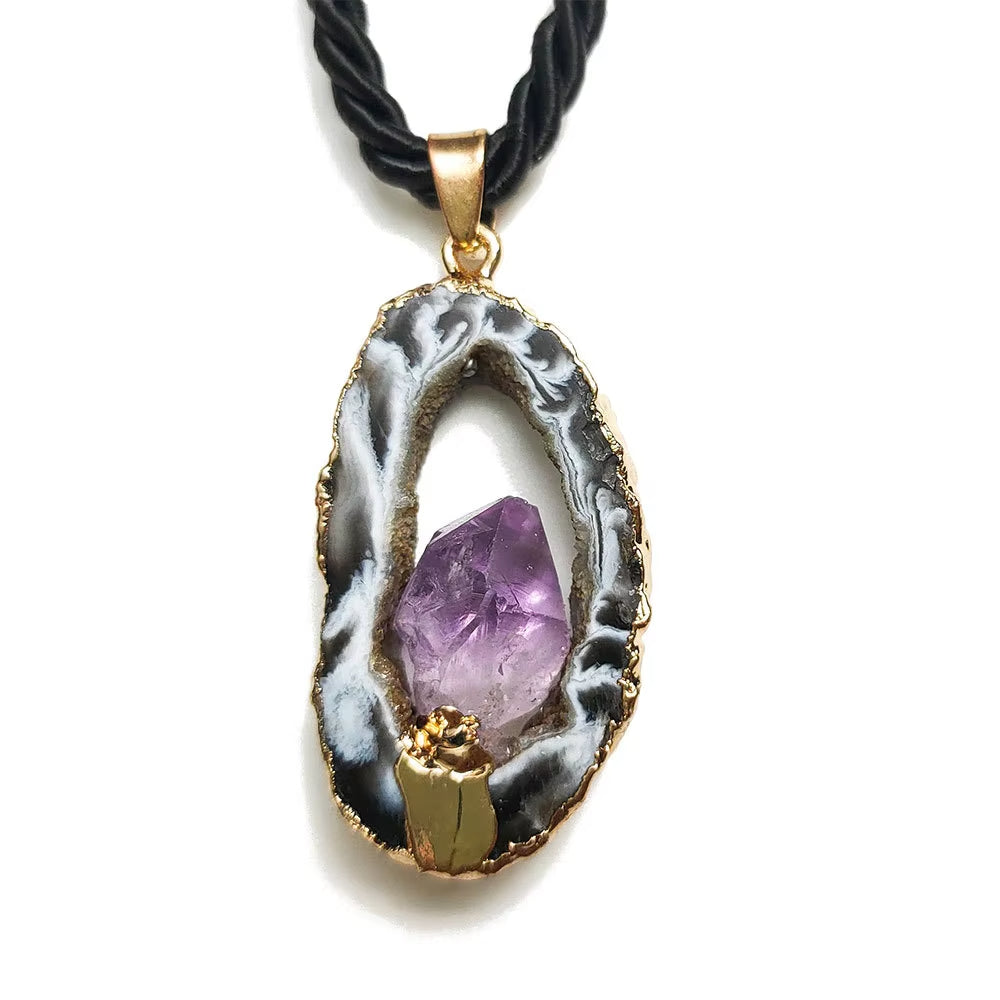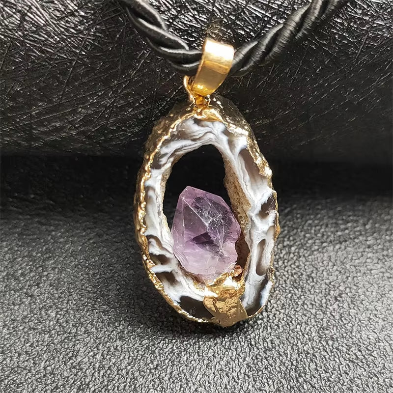 Feng Shui Necklace | Natural Openwork Agate with Amethyst Necklace Gilded/Sliced Edges