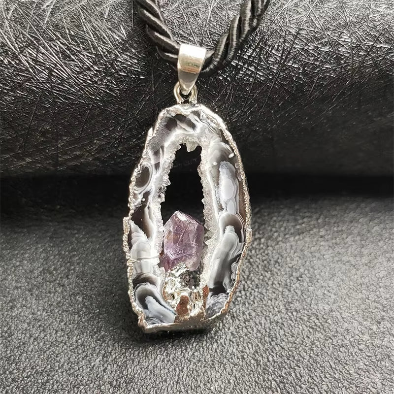 At Solumi.net, we believe jewelry should be both meaningful and beautiful. Each necklace features a slice of natural openwork agate with an embedded amethyst cluster, creating a harmonious balance between stability and spiritual awareness.